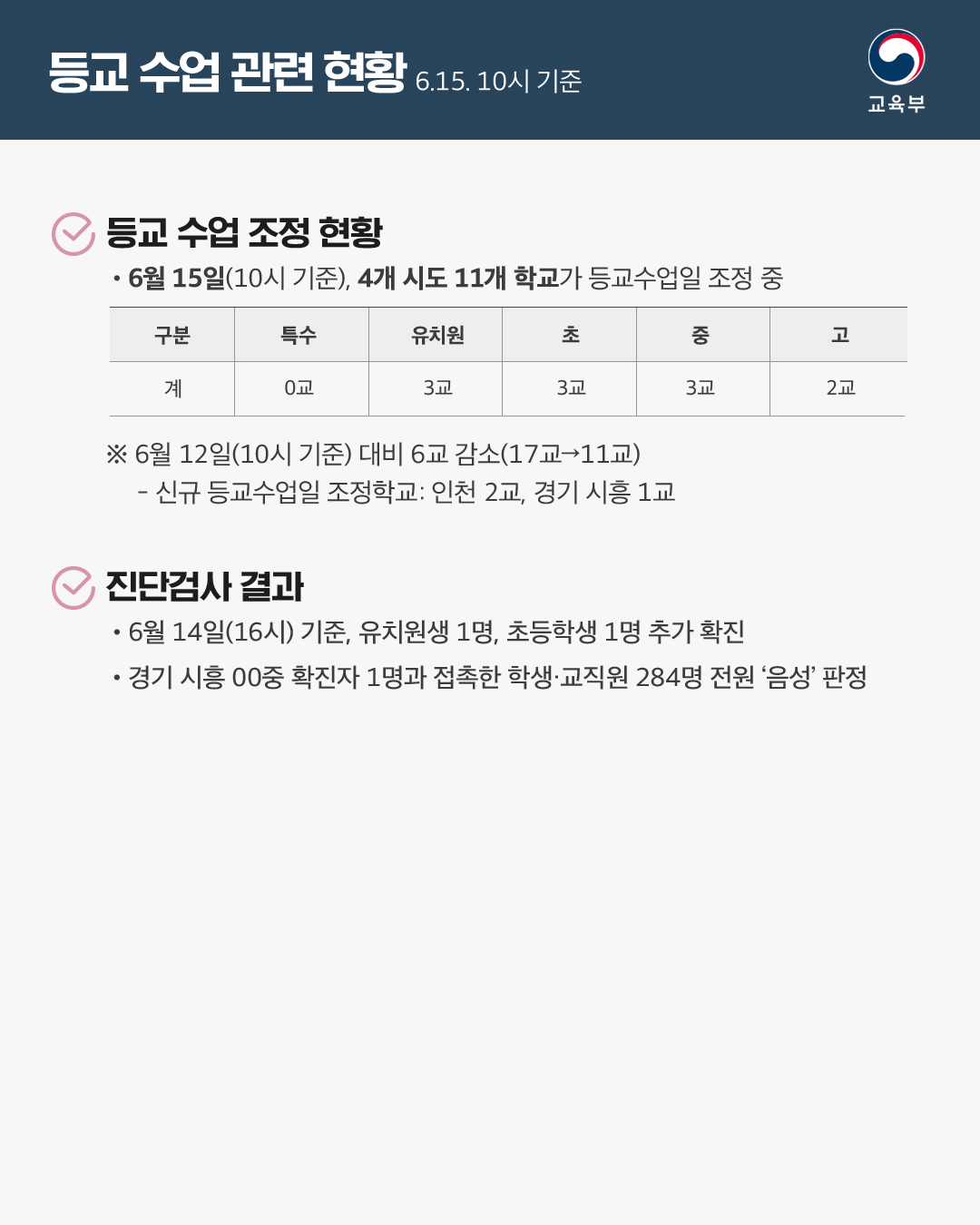 - 6월 15일(10시 기준), 4개 시도 11개 학교가 등교수업일 조정 중