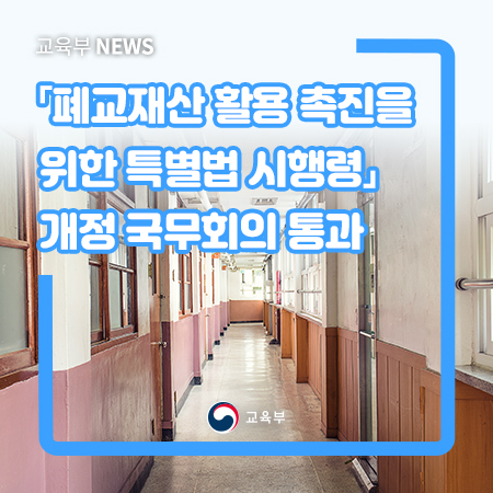 교육부(부총리 겸 교육부장관 유은혜)는 6월 16일(화)에 열린 국무회의에서 「폐교재산 활용 촉진을 위한 특별법 시행령」이 심의・의결되었다고 밝혔다.