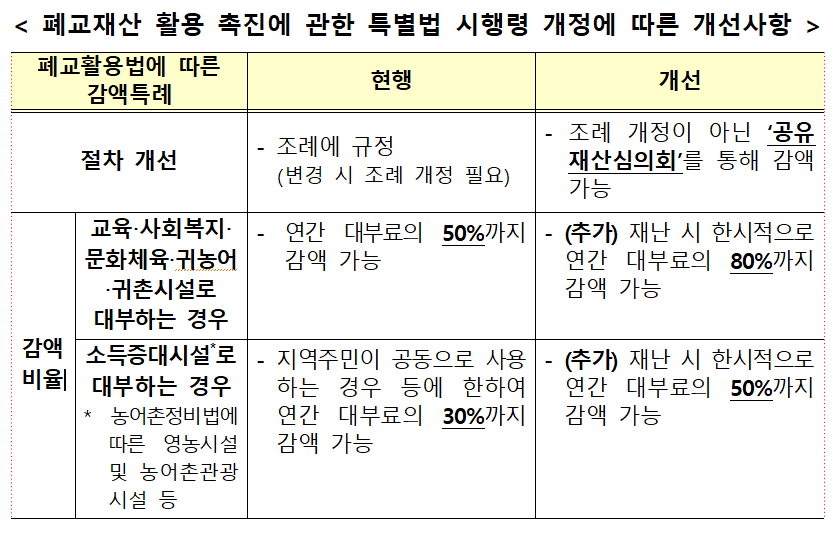 공적 용도로 폐교재산을 대부한 자들에게 코로나19 등 재난 시에는 한시적으로 △기존 연간대부료 감액가능비율을 추가적으로 확대하고, △조례 개정 대신 시도교육청별 공유재산심의회를 통해 대부료를 감액할 수 있도록 절차를 개선하였다.