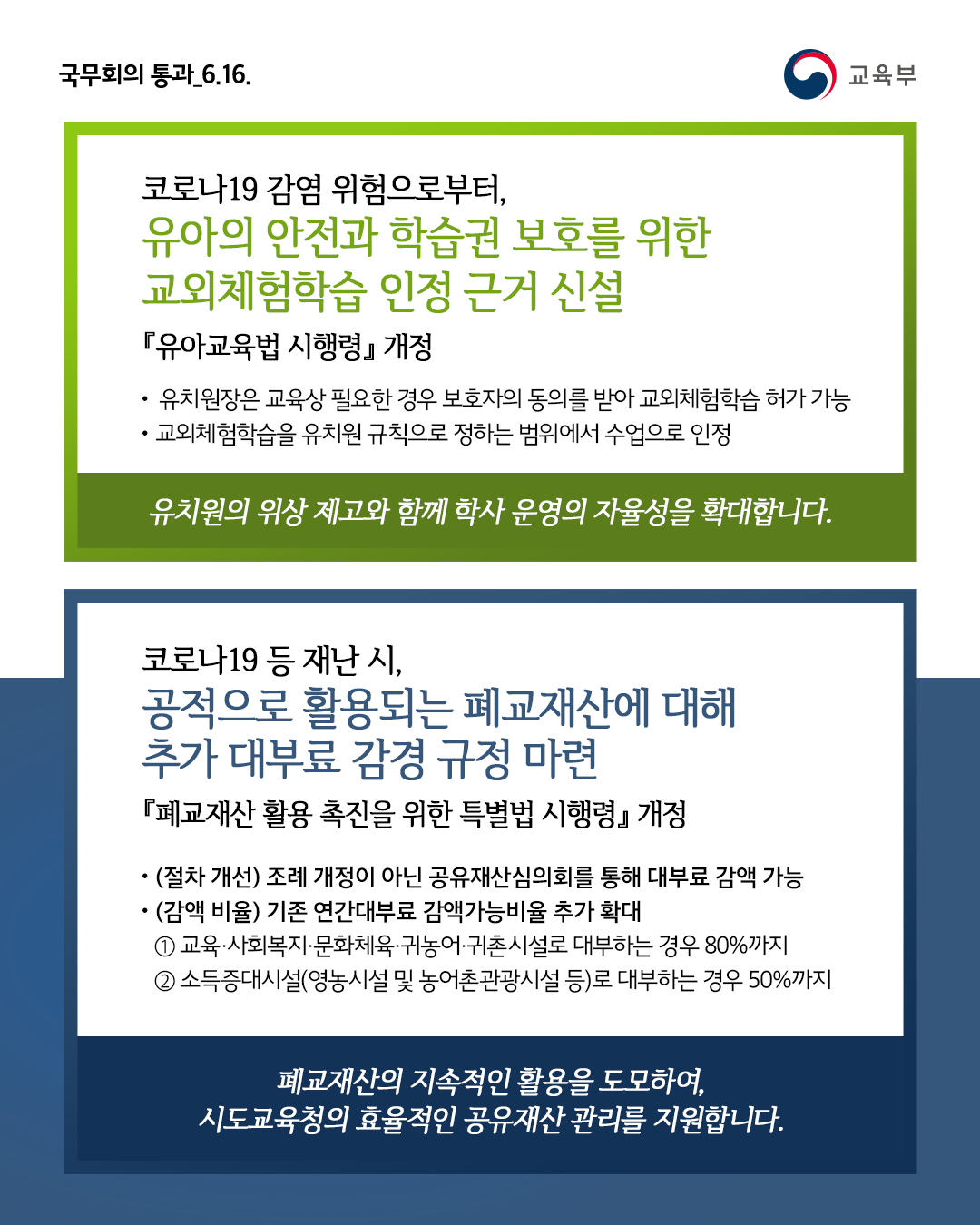 - 코로나19 등 재난 시, 폐교재산을 공적 용도로 대부한 자들에 개한 추가적인 대부료 감경 규정이 마련되었습니다.