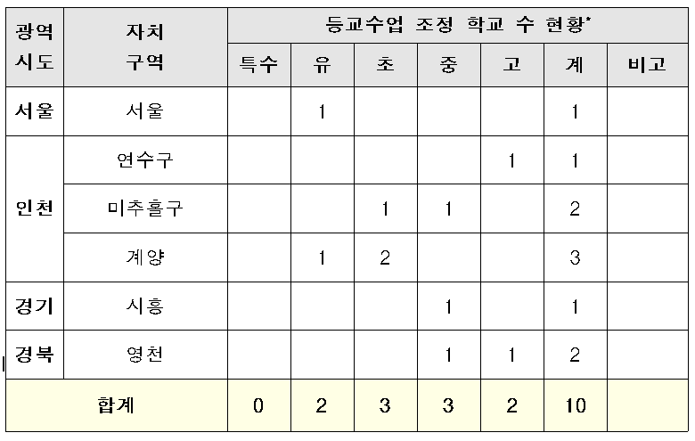 - 6.16.(월) 10:00 기준, 4개 시·도 10교 등교수업일 조정