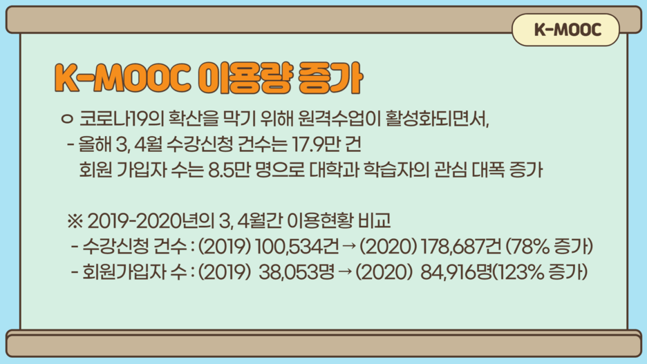 올해 3, 4월과 2019년 같은 기간의 K-MOOC 이용 현황을 비교해 보면 이용자가 대폭 증가한 것을 볼 수 있습니다. 코로나19 확산을 방지하기 위해 원격수업이 활성화되면서 수강신청 건수는 78% 증가, 회원가입자 수는 123% 증가하는 등 이용량에 큰 변화를 확인할 수 있죠.