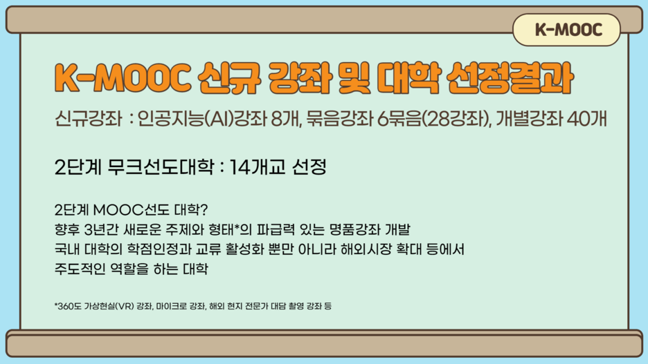 최근 교육부에서 발표한 2020년 K-MOOC 신규대학 및 강좌 선정결과에 의하면 인공지능강좌 8개, 묶음강좌 6묶음(28강좌), 개별강좌 40개 등 총 76개의 신규강좌가 선정되었고, 14개교가 2단계 무크 선도대학으로 선정되었습니다.