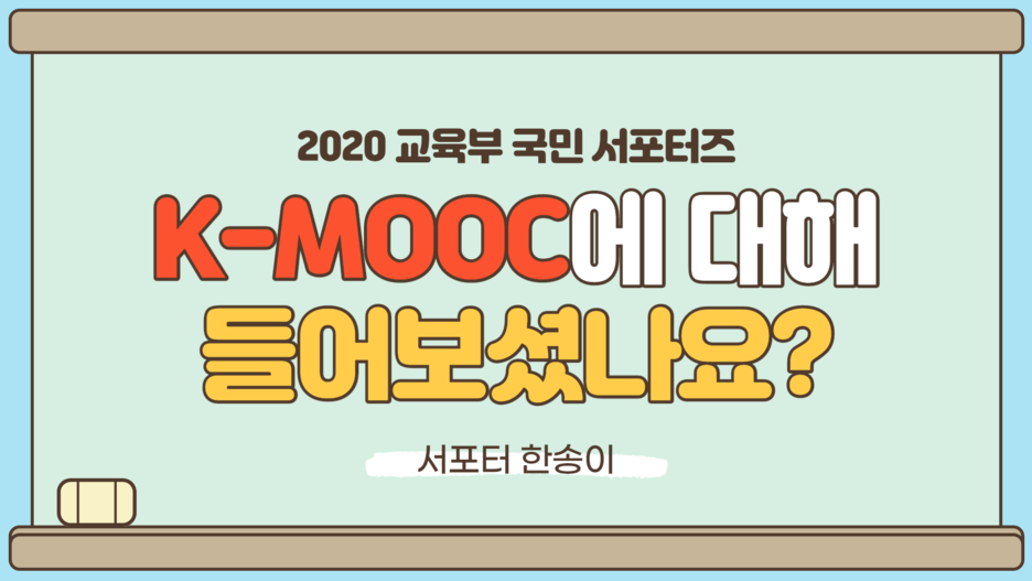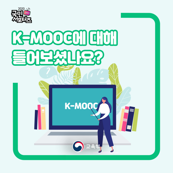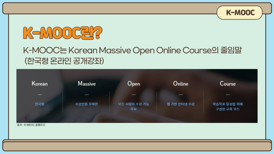 안녕하세요. 여러분! 요즘 온라인 수업 많이 듣고 계시죠? 특히 코로나19로 인해 비대면 수업이 전면 실시되면서 “K-MOOC”라는 단어도 많이 들으셨을 텐데요. K-MOOC가 무엇이길래 지금 같은 상황에 많은 사람들이 이용할까요?