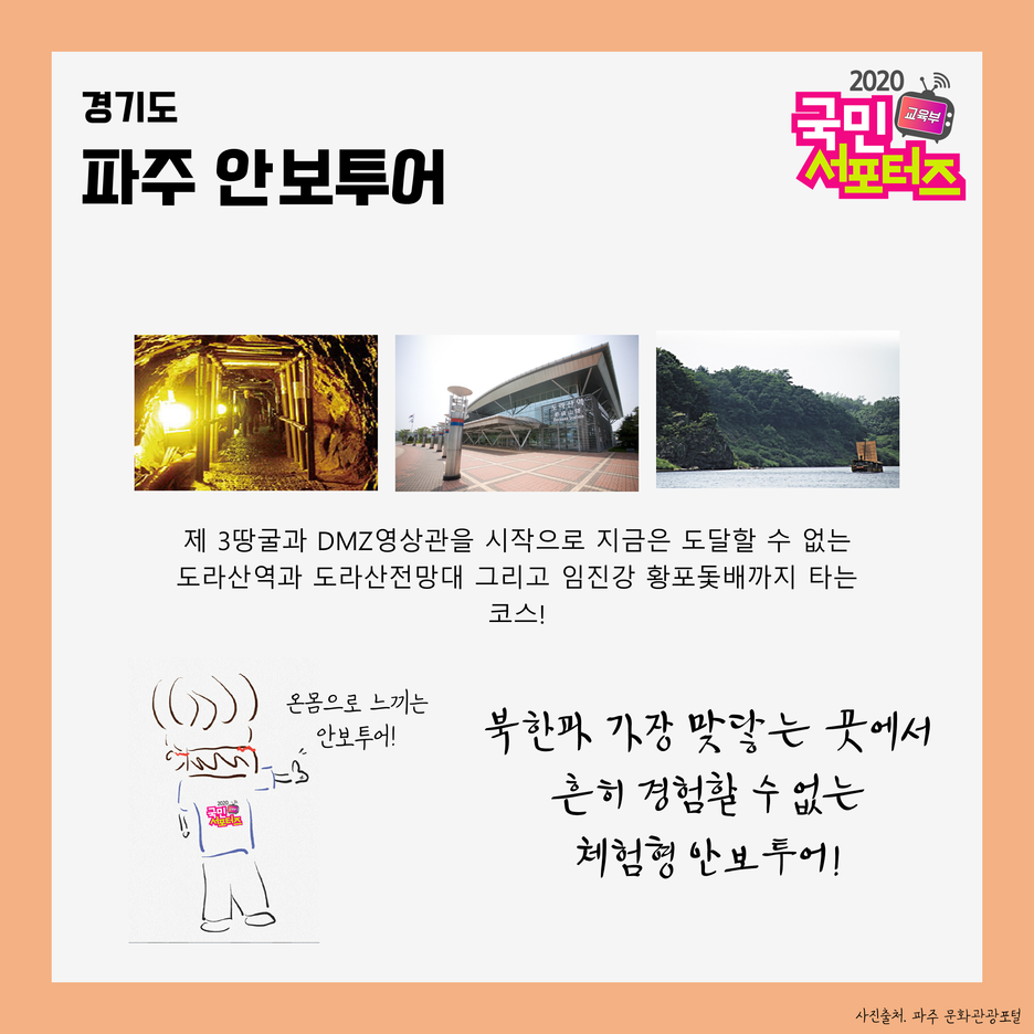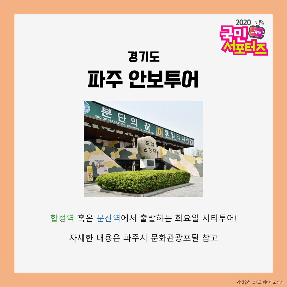 두 번째 장소는 파주입니다.세계 유일한 분단국가인 대한민국 가슴 아픈 역사를 파주에서 안보투어를 하며 배울 수 있습니다.