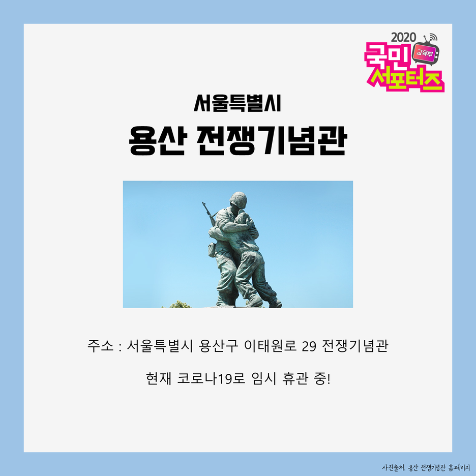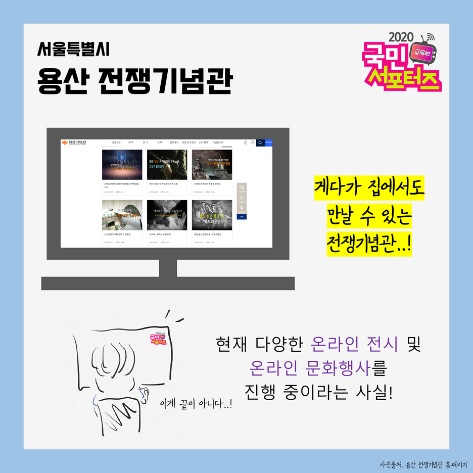 그리고 코로나19로 방문이 제한되는 만큼 용산 전쟁기념관에서는 다양한 온라인 전시와 교육자료를 제공하고 있으니 홈페이지를 방문해보세요.또한 호국보훈의 달을 맞이하여 손글씨 챌린지,현충일 온라인 그림그리기·글짓기 대회도 진행하고 있다고 하니 참여하여 순국선열과 참전용사 분들에게 감사의 마음을 전하는 시간을 가져보는 것도 좋겠죠?