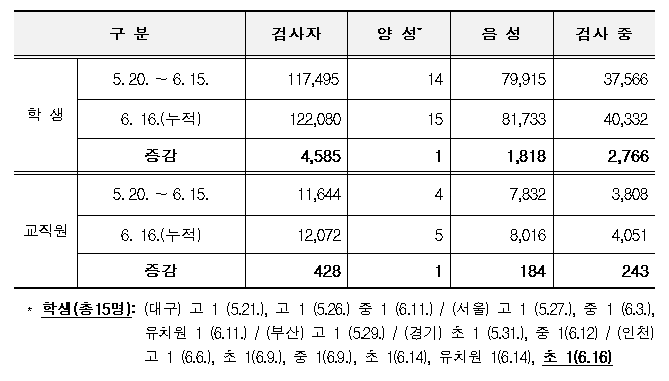 - 6.16.(화) 24:00 기준, 등교 이후 확진자 전일대비 초등학생 1명,