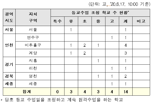 - 6.17.(수) 10:00 기준, 5개 시도 14교 등교수업일 조정
