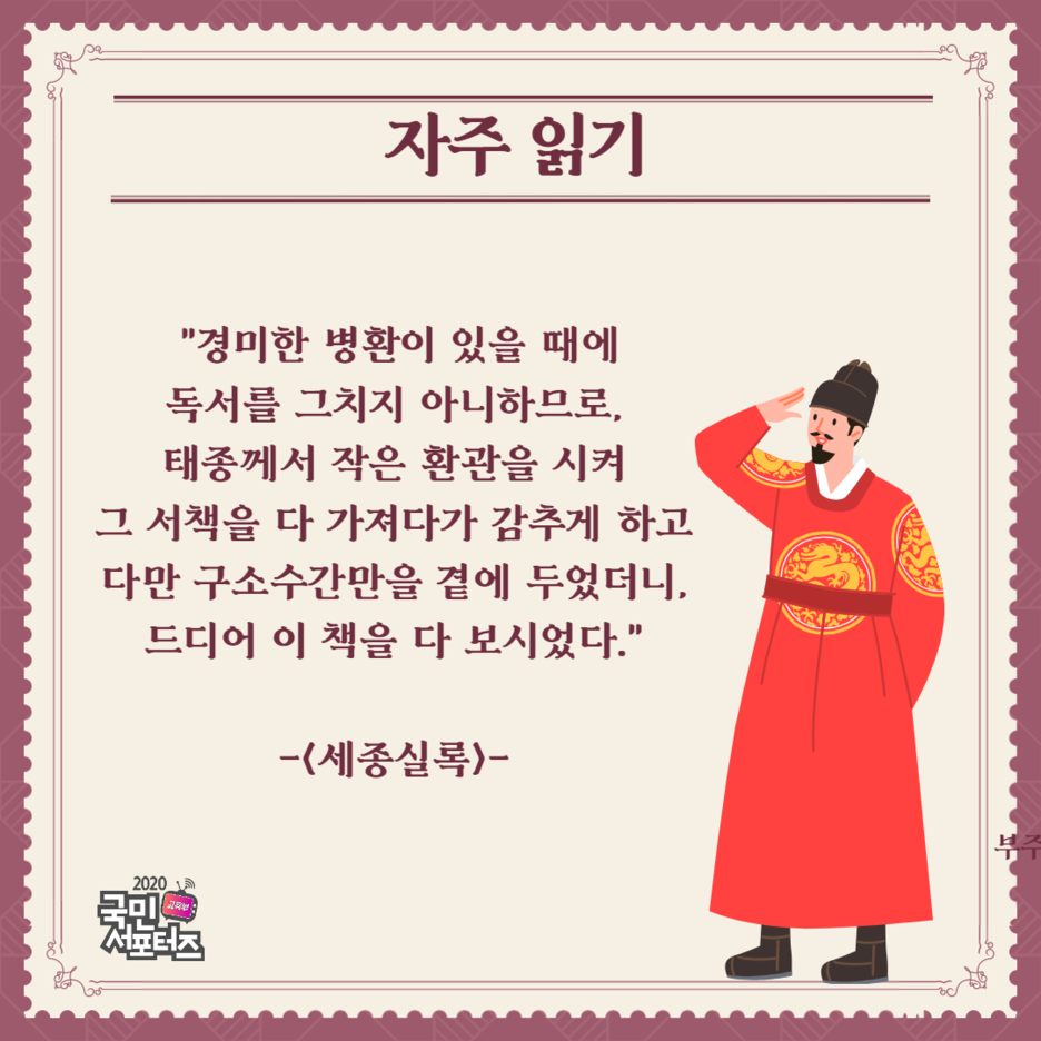 이 일화는 세종대왕의 가장 유명한 일화 중에 하나입니다. 세종대왕이 병환에 있을 때도 책을 읽으려고 하는 바람에 태종은 그의 방에서 모든 책을 다 감추어버립니다. 하지만 구소수간(歐蘇手簡)이라는 책 한 권은 남겨두었는데요. 세종대왕은 그 '구소수간'이라는 제목의 책이 닳을 때까지 무려 1000번이나 읽었다고 합니다.