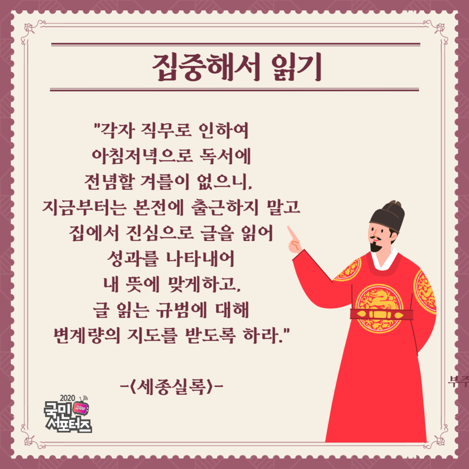 집중해서 읽는 것은 매우 중요합니다. 한 권의 책을 몇 번에 걸쳐 나누어 보게 되면 앞의 내용이 기억나지 않아 다시 앞으로 돌아가서 읽어야 하는 경우도 많습니다. 따라서 기억이 온전할 때 최대한 집중해서 읽는 것이 중요합니다. 세종대왕도 이렇게 독서에는 집중과 흐름이 중요하다는 것을 알고 신하들에게 독서를 위한 특별 휴가를 주기도 했습니다. 신하들이 마음 놓고 독서에 몰입하게 하기 위해서 휴가까지 주며 집중하면서 읽는 것을 장려했던 것입니다. 신하들의 독서를 위하여 특별 휴가까지 준 세종대왕, 그가 얼마나 집중해서 하는 독서를 중요하게 생각했는지 잘 드러나는 부분입니다.