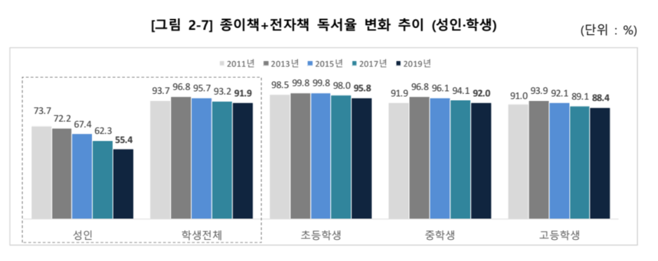 여러분들은 책 좋아하시나요? 책 읽기의 중요성은 익히 들어 알고 있지만, 막상 책을 읽기란 쉽지 않습니다. 문화체육관광부가 발표한 2019년 국민 독서 실태조사에 따르면 지난 1년 동안 '종이책 또는 전자책을 한 권 이상' 읽은 독서인구 비율은 성인 55.4%, 초중고 학생은 91.0%로 나타났습니다. 이것은 2017년 대비 성인의 독서율은 6.9%p, 학생은 1.3%p 하락한 것입니다.