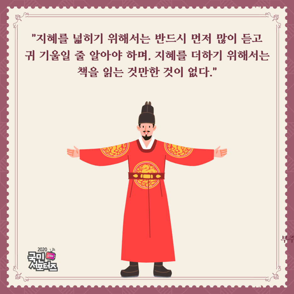 책은 우리의 삶의 여러 문제에 대한 해답을 내려줄 뿐만 아니라 세상을 보는 안목이 높아지게 합니다. 쉼 없이 바쁜 일상 속에서, 오늘은 책을 한 권 읽어보는 것은 어떨까요? 마지막으로 세종대왕이 남긴 독서 명언을 하나 확인하고 마치도록 하겠습니다.
