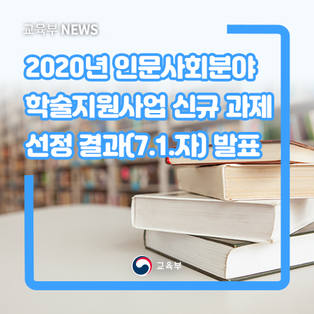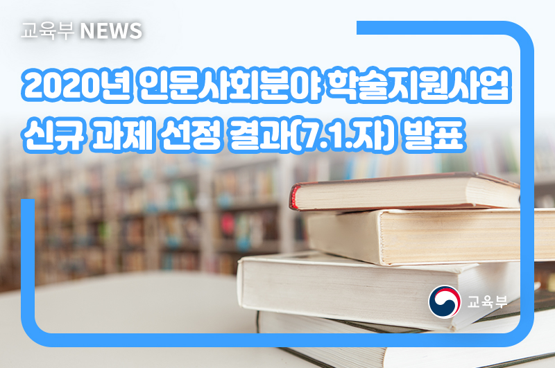 교육부(부총리 겸 교육부장관 유은혜)와 한국연구재단(이사장 노정혜)은 6월 23일(화), ‘2020년 인문사회분야 학술지원사업 신규과제(7.1.자 연구개시) 선정 결과’를 발표하였다.