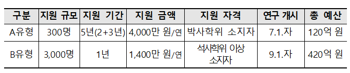 이 사업은 창의적․도전적이고 연구력이 높은 학문후속세대 연구자들이 연구 활동을 단절하는 일이 없도록 연구 안전망을 구축하여, 경쟁력 있는 연구자를 체계적으로 육성하고자 설계하였다. 연구자 선정은 지원 규모·기간에 따라 A유형․B유형으로 진행하고 이번에는 우선 297명의 A유형 선정 결과를 발표하였다.