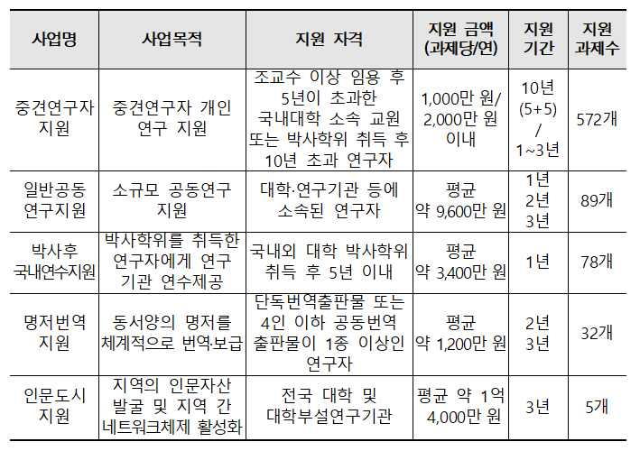 ‘인문사회분야 학술지원사업’은 인문사회분야 연구자들의 창의적 지식 창출을 견인하고 학술연구의 균형적 발전을 유도하기 위해 교육부가 1963년부터 추진해온 사업이다.