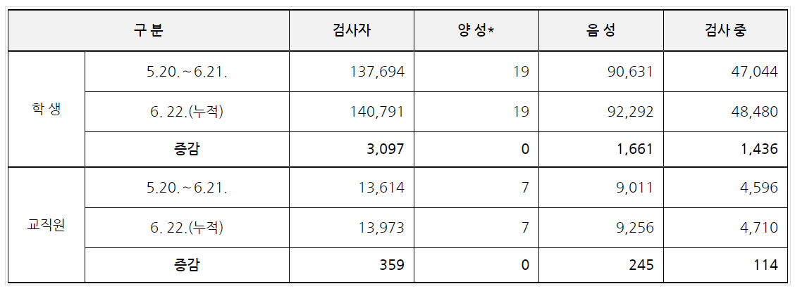 교직원(총7명):(인천) 초 1(교사, 5.29.) / (경북) 고 1(교사 5.31.), 고 1(교사 6.4.) / (경기) 유치원 1(운전기사, 6.2.),고 1(교사, 6.16), 초 1(교사, 6.17) / (서울) 초 1(조리원, 6.1)