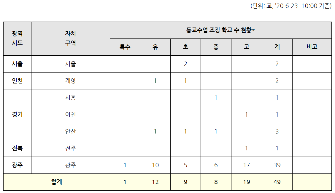 - 6.23.(화) 10:00 기준, 5개 시·도 49교 등교수업일 조정