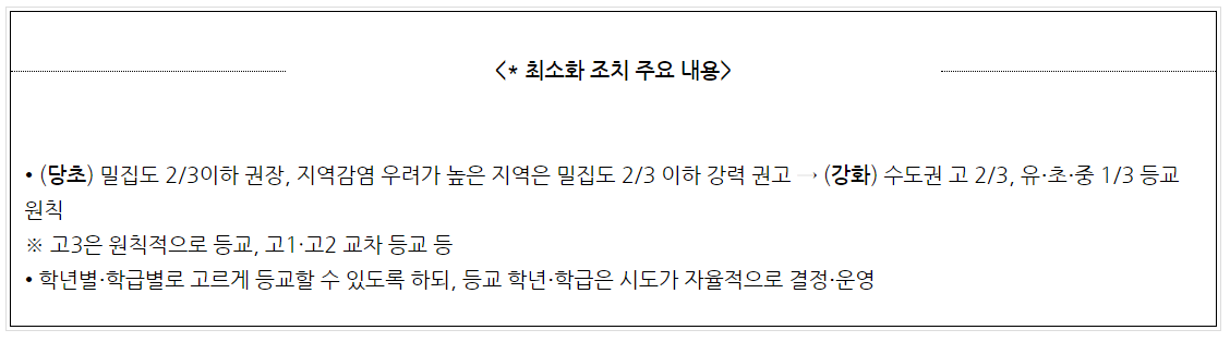 학교내 밀집도 최소화 조치 종료 기한을 잠정 연기하고 수도권 지역 대상 강화된 방역조치와 연계하여종합 검토 후 추후 확정