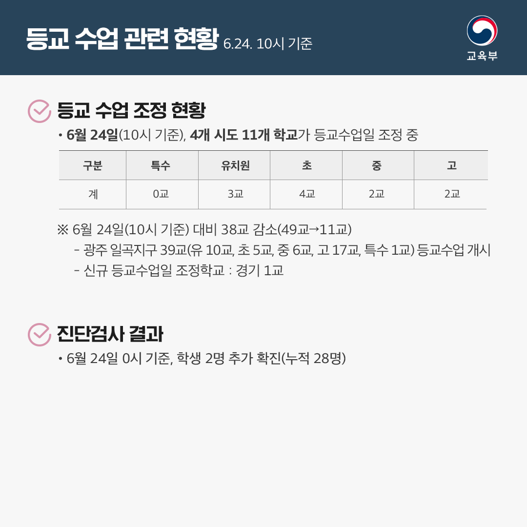 - 진단검사 결과 6월 24일 0시 기준, 학생 2명 추가 확진