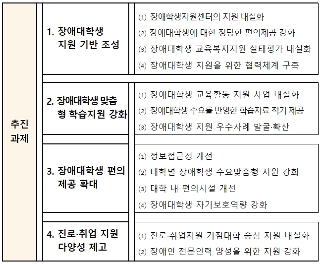 장애대학생 맞춤형 학습지원 강화, 장애대학생 편의제공 확대, 진로·취업지원 다양성 제고