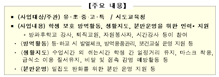 등교 수업 이후 방과후학교 강사 등이 참여하여 학생 안전을 최우선적으로 확보하기 위해 방역활동, 생활지도, 분반 운영 실시