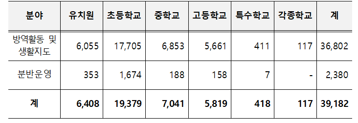 ※ 학교 교육활동 지원 인력 배치 계획(6.2. 기준) 40,510명 대비 96.7%(39,182명) 배치하였고, 지속적으로 단위학교에서 교육활동 지원 인력 배치를 추진 중에 있음