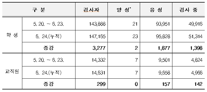 - 6.25.(목) 00:00 기준, 등교 이후 확진자 전일 대비 학생 2명 추가 확진 【누적 30명(학생 23명, 교직원 7명)】