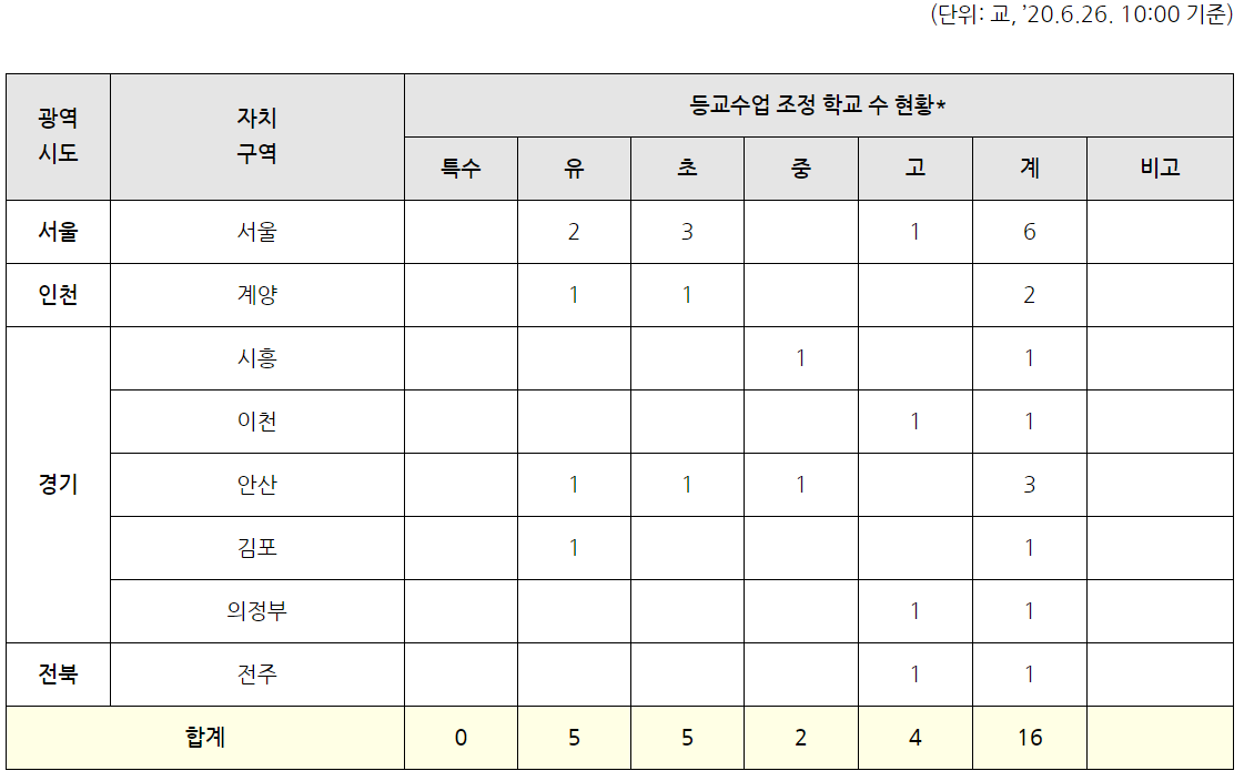 - 6.26.(금) 10:00 기준, 4개 시·도 16교 등교수업일 조정