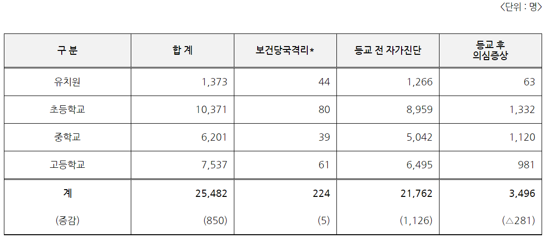 - 6.26.(금) 00:00 기준, 등교 이후 확진자 전일 대비 변동 없음(누적 30명(학생 23명, 교직원 7명))