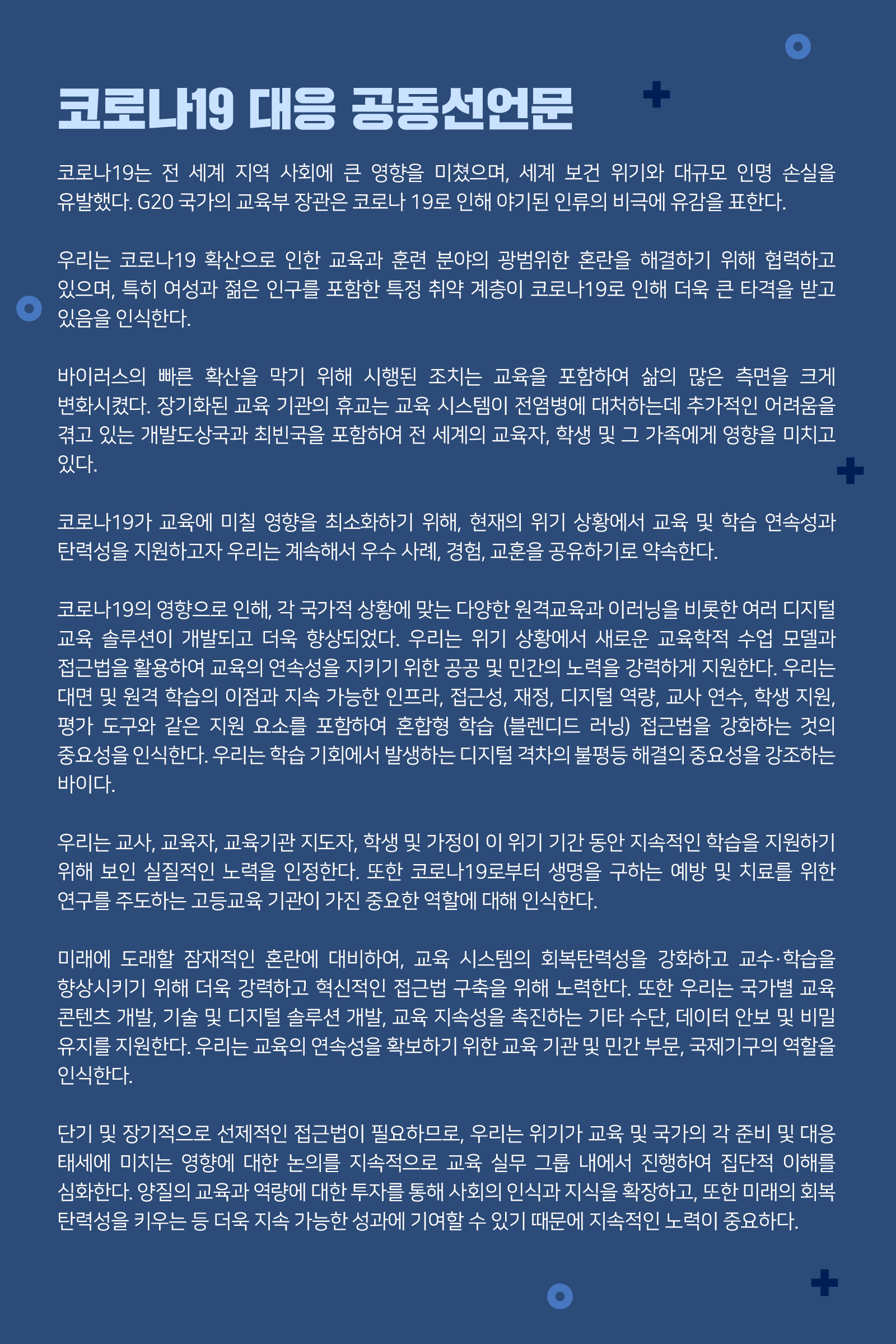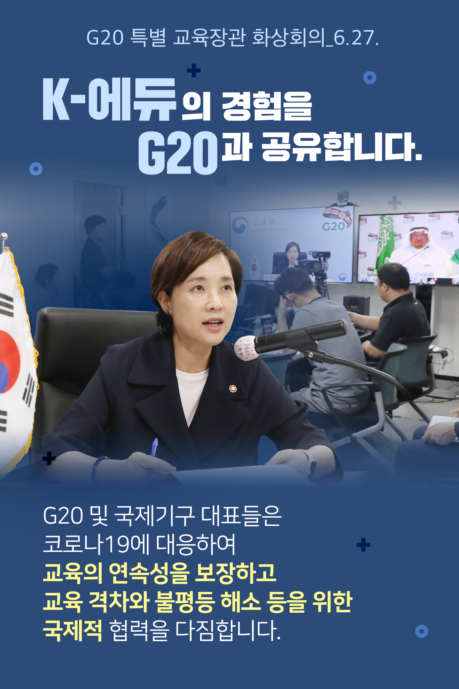 사우디아라비아 교육부(2020년 G20 의장국)가 개최한 이번 회의는 G20 및 국제기구 대표들이 참여하였으며, 교육 분야에서 코로나19의 영향과 각국의 대응 사례를 공유하고, 위기 극복을 위한 국제적 공조 노력을 강조한 공동 선언문 (G20 Education Ministers’ Statement on COVID-19)을 채택하였습니다.