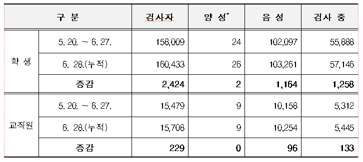 - 6.29.(월) 00:00 기준, 등교 이후 확진자 전일 대비 2명 추가 확진(누적 35명(학생 26명, 교직원 9명))