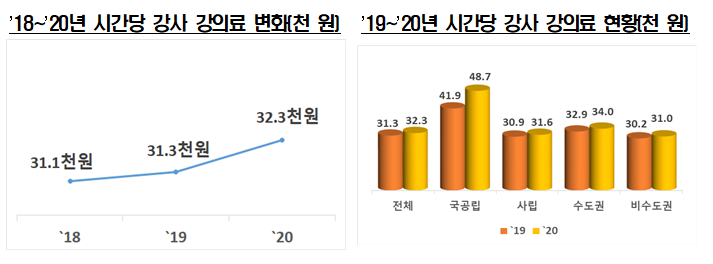 국공립대학의 강사 강의료 평균은 48.7천 원으로 전년(41.9천 원)보다 6.8천 원(16.4%) 상승하였으며, 사립대학은 31.6천 원으로 전년(30.9천 원)보다 0.7천 원(2.3%) 상승하였다.