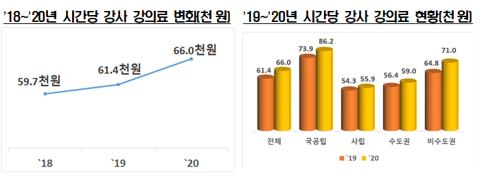 2020년 1학기강사 강의료 평균은 시간당 66.0천원으로 2019년(61.4천원)보다 4.6천원(7.5%) 상승하였다.