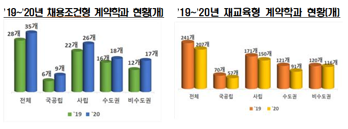 ‘재교육형’ 계약학과 수는 207개로 2019년(241개)보다 14.1% 감소하였고, 학생 수는 6,011명으로 2019년(6,590명)보다 8.8% 감소하였다.