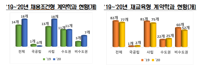 ‘채용 조건형’ 계약학과 수는 18개로 2019년(14개)보다 28.6% 증가하였고, 학생 수는 556명으로 2019년(480명)보다 15.8% 증가하였다.