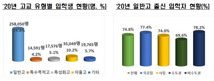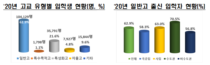 국공립대학의 일반고 출신 비율은 58.3%로 사립대학(63.0%)보다 4.7%p 낮았고, 수도권대학은 70.5%로 비수도권대학(56.8%)보다 13.7%p 높았다.