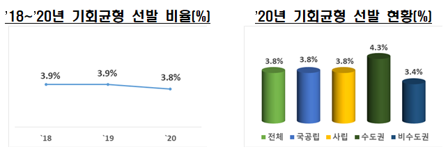 국공립대학의 기회균형선발 비율은 3.8%로 사립대학(3.8%)과 같았고, 수도권대학은 4.3%로 비수도권대학(3.4%)보다 0.9%p 높았다.