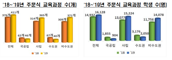 (주문식 교육과정 운영 현황) 2019년 주문식 교육과정* 수는 411개로 2018년(376개)보다 9.3% 증가하였고, 주문식 교육과정에 참여한 학생 수는 16,128명으로 2018년(14,932명)보다 8.0% 증가하였다.