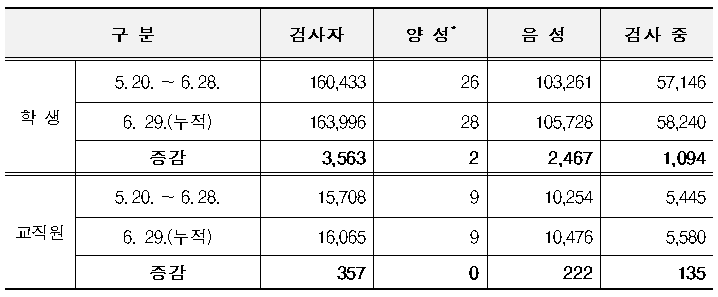 등교 이후 진단검사 현황(6.30. 00시 기준)