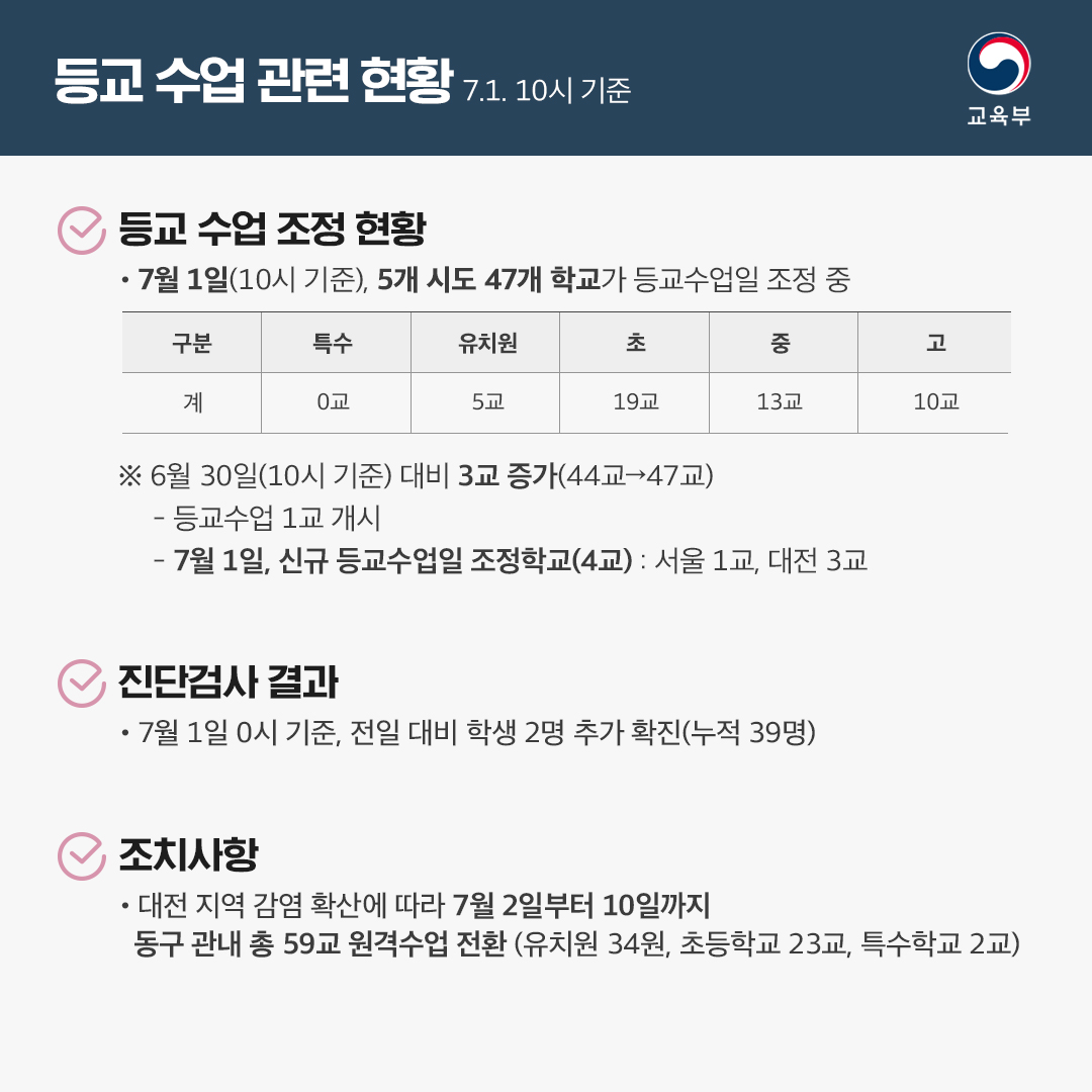 - 대전 지역 감염 확산에 따라 7월 2일부터 10일까지 동구 관내 총 59교 원격수업 전환