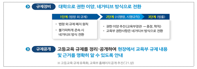 법령상 근거 없는 규제는 폐지한다는 원칙하에, 교육부 권한을 대학에 대폭 이양, 네거티브 방식으로 전환을 검토할 계획이다.