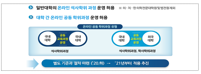또한, 국내대학과 외국대학 간 공동 교육과정 운영시에는 온라인 석사 학위과정과 온라인 학사학위과정 운영을 허용하여 이를 기반으로 다양한 교육프로그램을 개발․확산하도록 지원한다.