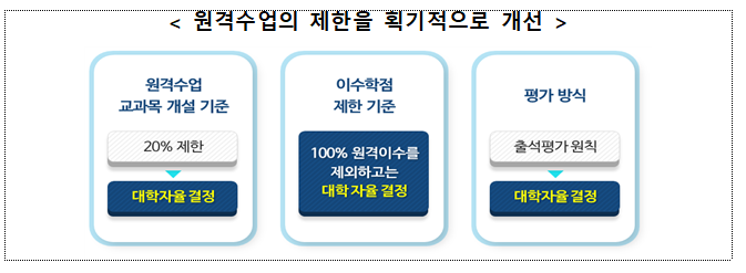 원격수업 운영에 대한 제한을 획기적으로 개선하여 학생이 학위취득에 필요한 학점 전부를 원격으로 이수하는 것만 아니라면 대학이 정하는 범위 내에서학위를 취득할 수 있도록 허용한다.