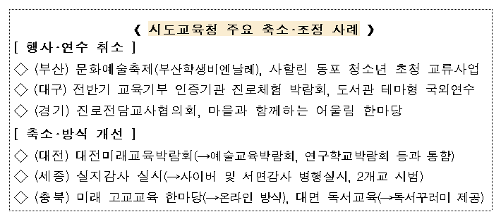 대부분의 시도교육청에서 학교를 대상으로 하는 교육청 추진 사업에 대한 자체 정비를 통하여 학교에 부담이 되는 집합 방식의 대규모 행사나 연수 등은 취소‧축소하였으며, 꼭 필요한 교육청 정책사업은 코로나 상황에 맞게 사업 간 통합운영하거나, 온라인‧서면을 활용한 비대면 방식 등으로 추진 방법을 개선하였다.