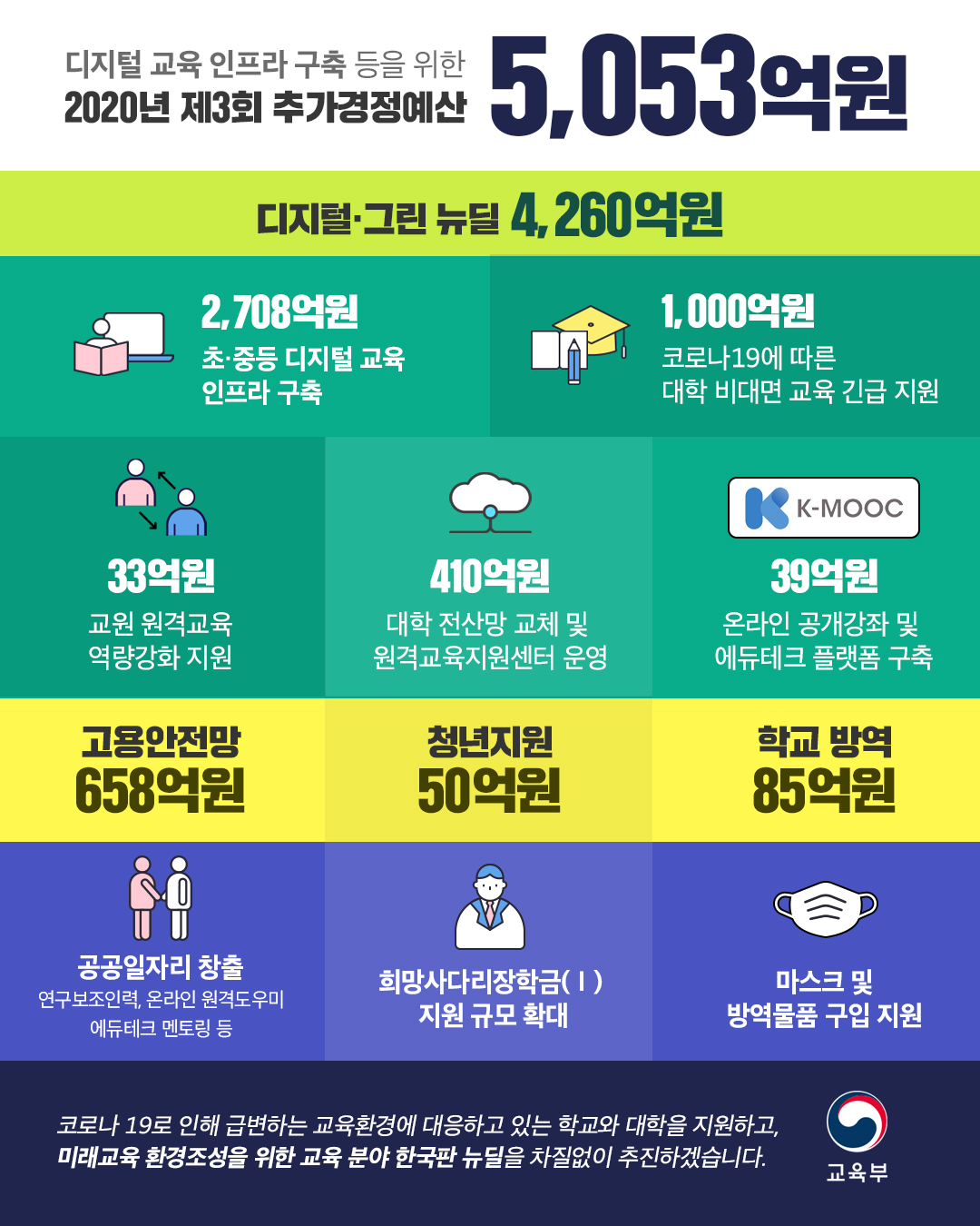 포스트 코로나 시대 대비 교육분야 한국판 뉴딜 추진을 위한 2020년 제3회 추가경정예산이 7월 3일 확정되었습니다.
