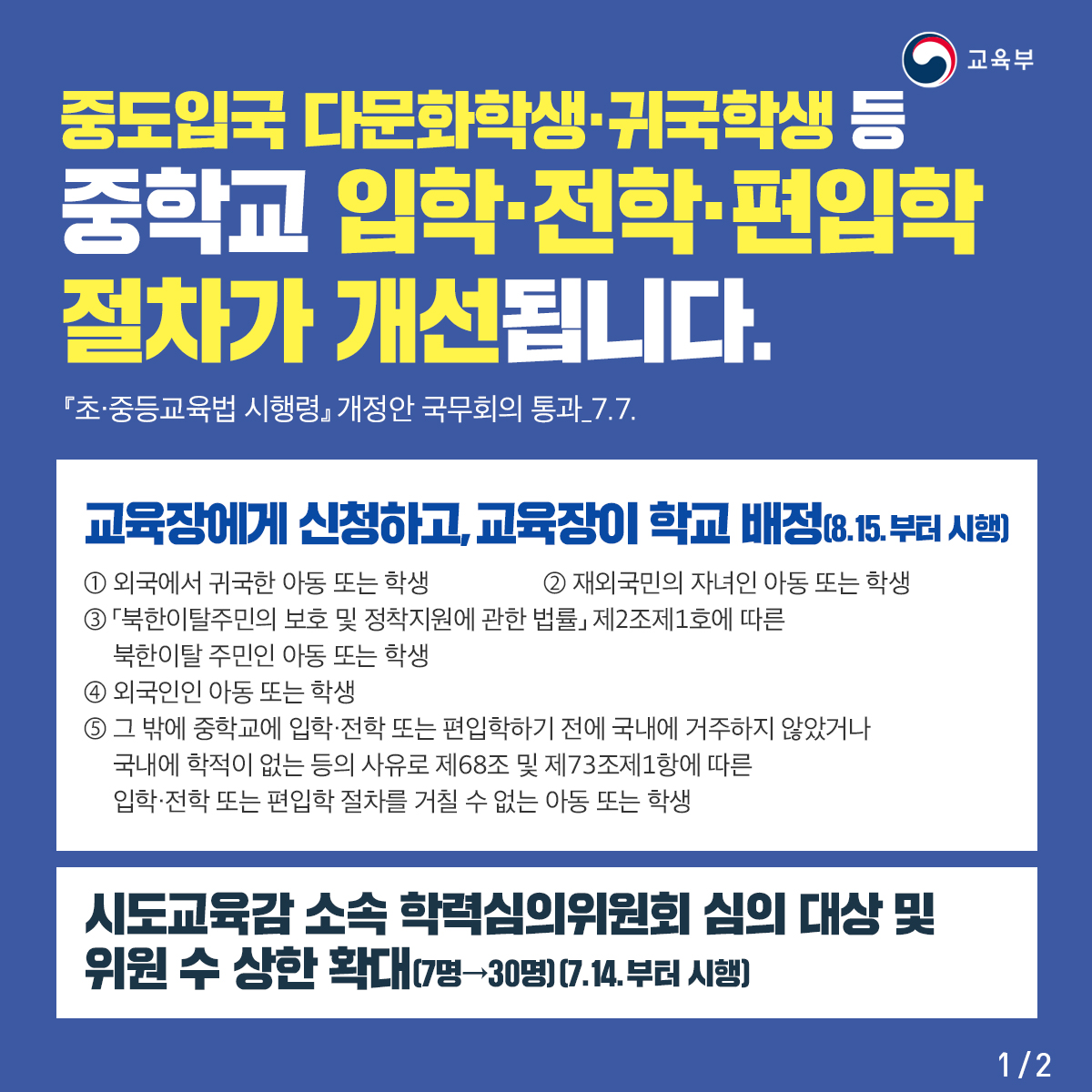 다문화학생·귀국학생 등 중학교 입학·전학 및 편입학 절차가 개선됩니다.