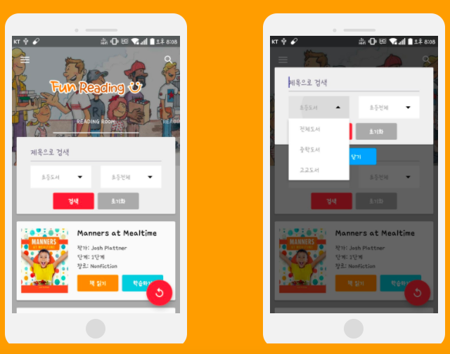 펀리딩은 리딩룸과 러닝룸으로 나뉘는데요. 리딩룸에서는 크게 초등 단계 1-3, 중학 단계 1-3, 고교 단계 1-3, 총 9단계에 따른 영어 원서를 통한 다독 학습을 제공하고 있습니다. 리딩룸의 영어 원서는 소설, 픽션, 그림책 등 여러 장르별로 나눠지기 때문에 학생들은 자신의 수준에 맞게 읽고 싶은 책을 자유롭게 선택할 수 있습니다. 따라서 단계와 장르를 설정한 후에 연관된 영어 원서가 책 표지와 간단한 한국어 설명으로 나열됩니다. 여기서 학생들은 선택한 책에 대해 관심 여부를 판단하여 읽을 수 있습니다.