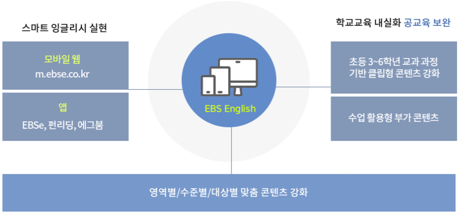 이 계획에 따라 교육부는 초등학생들이 언제 어디서나 읽고 싶은 영어책을 읽을 수 있도록 다양한 주제와 수준의 도서를 구비한 EBSe 온라인 영어 독서 프로그램 (EBSe Fun Reading)을 확대 및 개편했습니다. 이 외에도 교과서별, 차시별 학습 영상 및 중학교 연계 교육과정 영어 프로그램 등 EBS 영어 학습 콘텐츠를 확대 제공하였습니다.