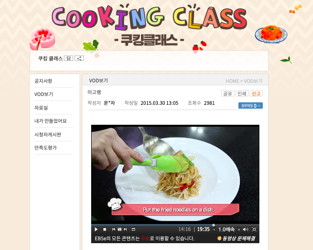 EBS 영어에서 제공되는 쿠킹 클래스 코너는 학생들이 요리를 통해 영어를 배우고, 영어에 대한 흥미를 지속시킬 수 있는 콘텐츠를 제공합니다. 쿠킹 클래스에서는 한식뿐만 아니라 베트남, 중국, 서양식 등 다양한 나라의 요리 레시피가 영어로 제공되고 있는데요. 학생들은 자신이 관심 있는 요리 혹은 배우고 싶은 요리를 선택하여 영어로 설명되는 영상, 프레젠테이션을 통해 레시피를 접할 수 있습니다.