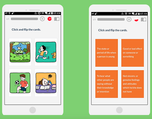 미션 게임은 학생들이 영어 단어 학습에 흥미를 느낄 수 있도록 단어 뜻 터치, 음성 찾기 카드 게임 등 미션을 수행하게 합니다. 이 단계는 본격적으로 학습하기에 앞서 미리 어떤 단어들을 배울 것인지 인지하고 흥미를 유발시키는 단계입니다.